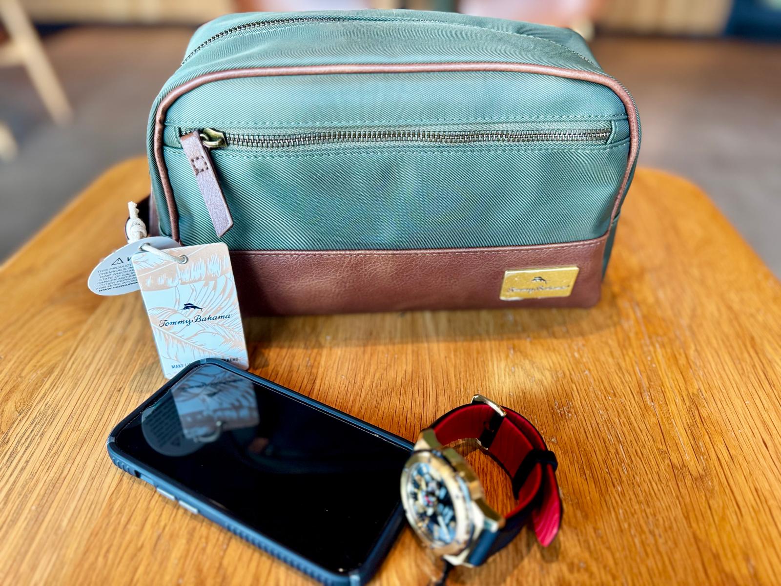 Bolsa organizadora Tommy Bahama con diseño elegante y materiales premium. Combina tela resistente con detalles tipo piel para un look sofisticado y moderno. Ideal para llevar tus esenciales como celular, reloj, llaves y accesorios personales con estilo y orden.
